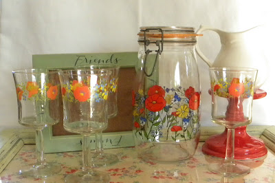 I excitedly took my new treasures up to the register to pay and surprise, surprise the glasses and juice jar where white tagged...50% off. Whoo...hoo...This is going to fun!